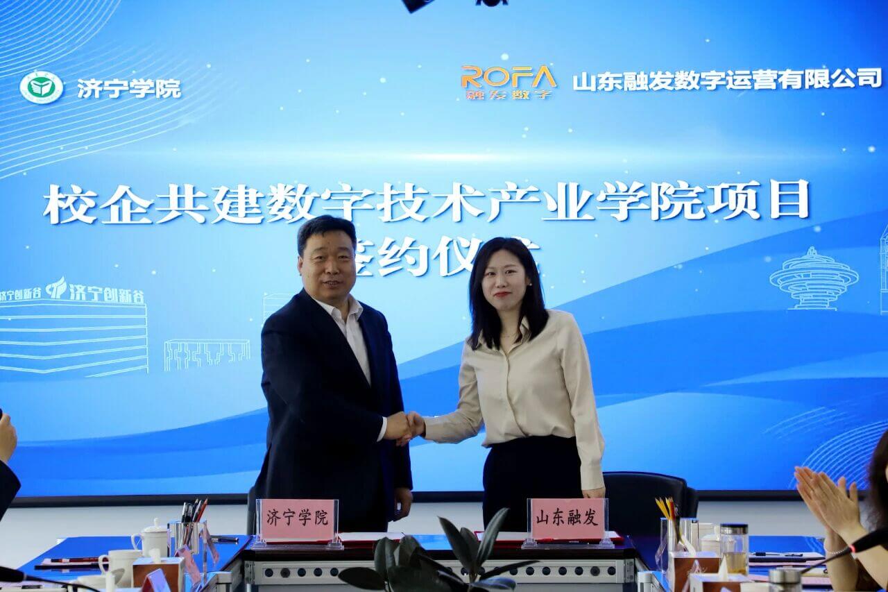5月9日,济宁国家高新区管委会、济宁学院、济宁市土地发展集团与山东融发数字运营有限公司举行校政企共建产教融合基地新模式战略合作及校企合作共建数字应用产业学院签约仪式,济宁国家高新区党工委副书记、管委会副主任王亚栋,党工委委员、管委会副主任徐廷福及济宁国家高新区投资促进局相关负责同志,济宁学院党委副书记、校长王清明,党委副书记丰家雷及相关负责同志,济宁市土地发展集团党委书记、董事长吕心愿,党委副书记、总经理王佳伟,党委委员、董事、副总经理杨绍军,总经理助理章寒,山东融发数字运营有限公司总经理王晴晴及产教融合中心李春辉、李成磊参加签约活动。