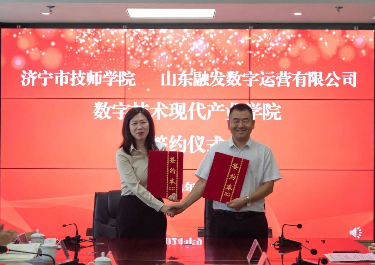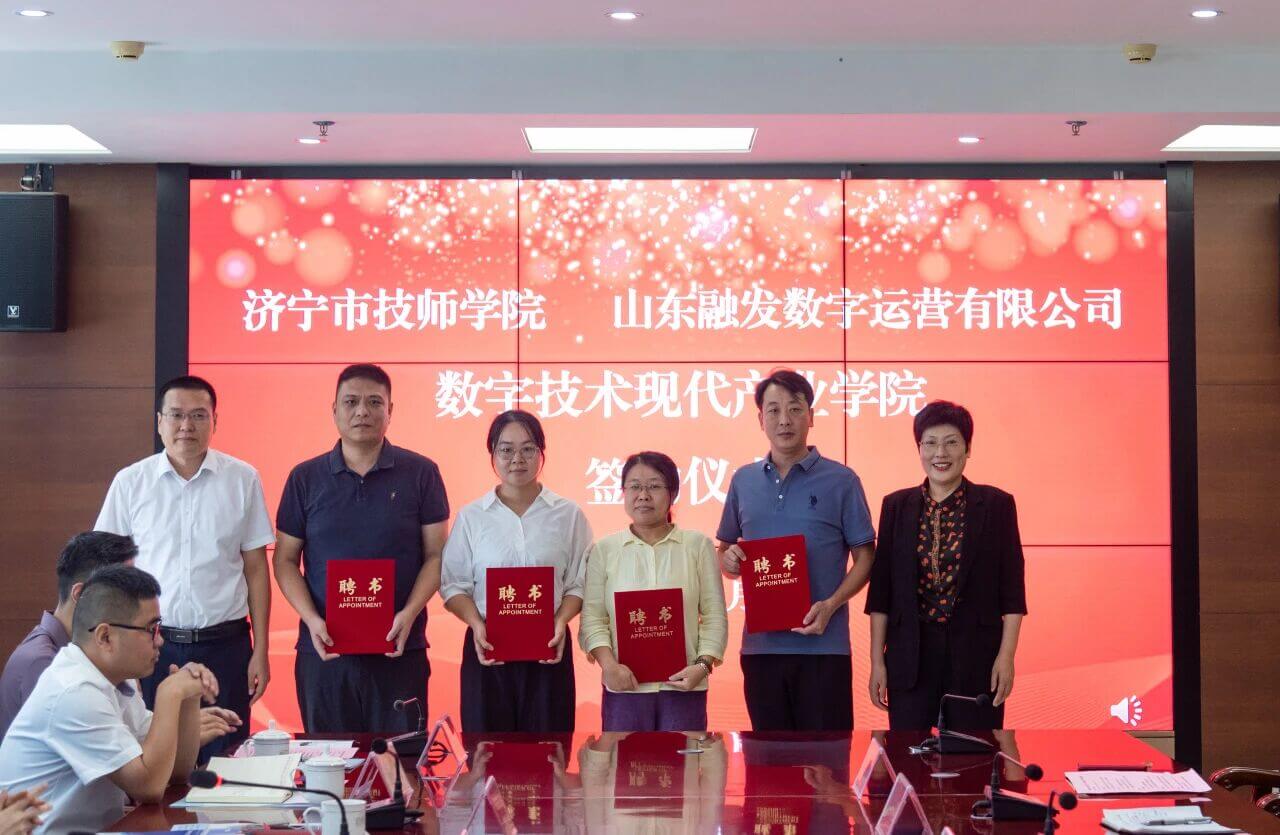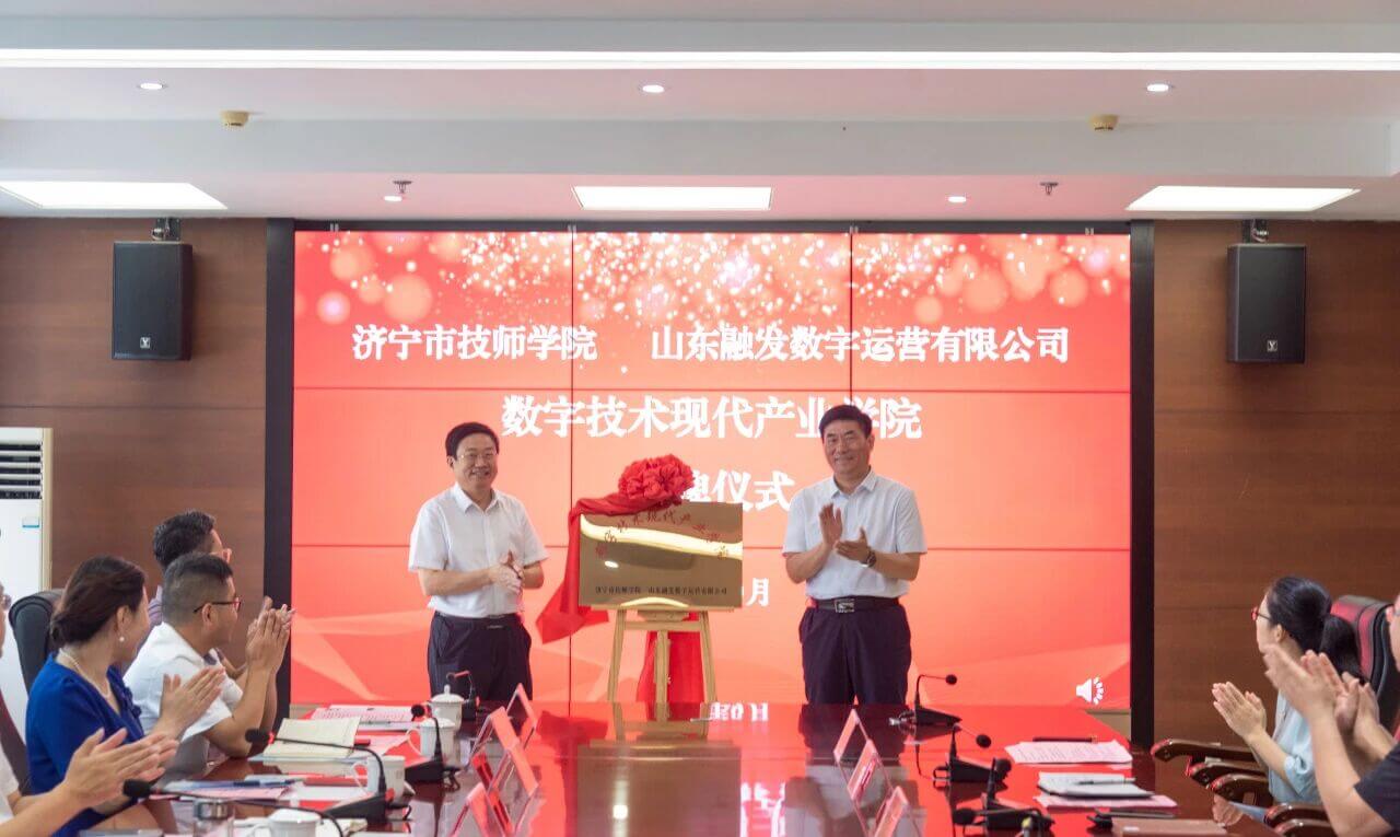 9 月 4 日,山东融发数字运营有限公司与济宁市技师学院共建数字技术现代产业学院签约暨揭牌仪式在济宁市技师学院举行。济宁市技师学院党委书记张玉强、院长杨楠等院校领导,市土地发展集团有限公司党委副书记、总经理王佳伟,党委委员、董事、总经理杨绍军等企业领导,高新区党工委组织部(人力资源部)副部长赵永刚,山东融发数字运营有限公司总经理王晴晴等也共同见证了这一重要时刻。