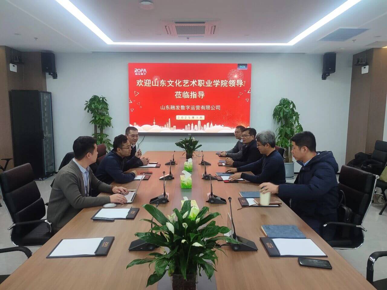 1 月 3 日,山东文化艺术职业学院党委书记张东林、副院长王萌、纪委书记胡学林、教务与科研处牵头人胡晓丽、戏曲系舞台艺术设计与制作专业负责人崔艺、以及艺术设计系数字媒体艺术设计专业教师梁爽一行到访腾讯云・融发数字经济人才培养示范基地。山东融发数字运营有限公司董事长刘朋、神州融科董事长张振龙、产教市场经理王成忠热情接待并陪同参观洽谈。