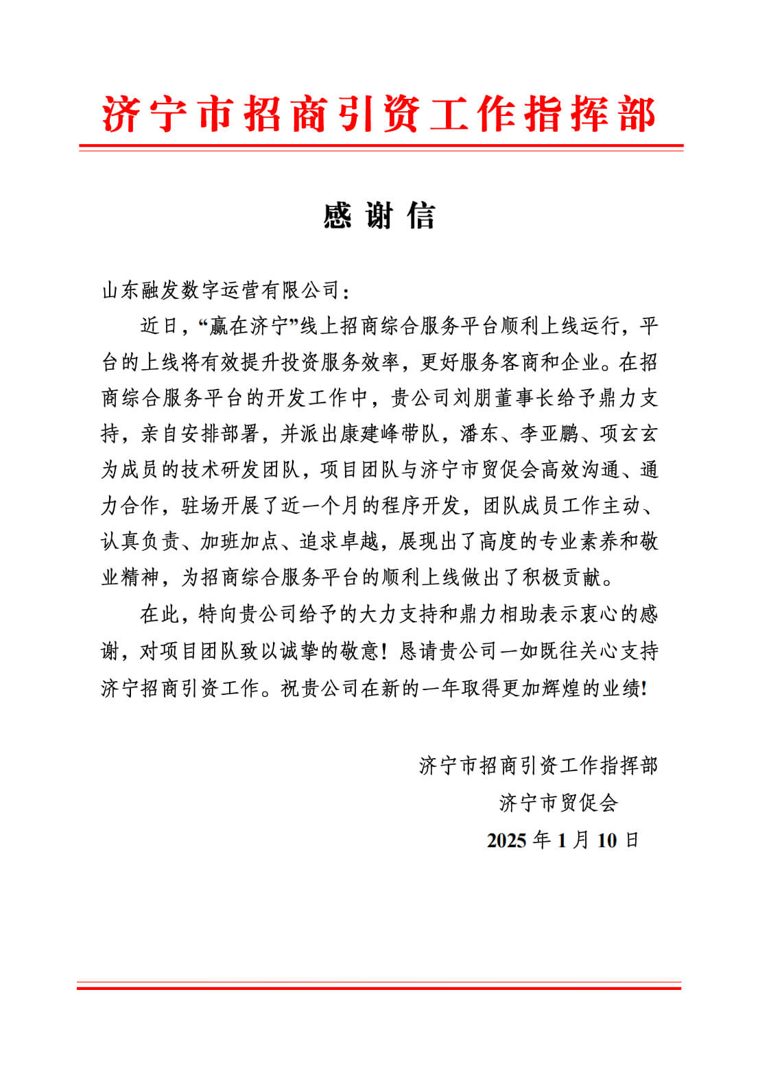 1月10日,济宁市招商引资工作指挥部、济宁市贸促会发来感谢信,对融发公司开发的“赢在济宁”线上招商综合服务平台表示感谢,对技术研发团队认真负责、结果导向、追求卓越的工作态度和服务精神给予了高度肯定。