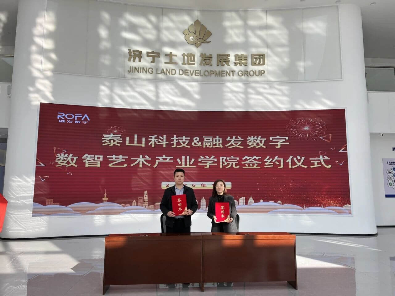 为推动教育链、人才链与产业链深度融合,提升人才培养与产业发展契合度,1月9日,泰山科技学院校长助理解嵘、艺术传媒学院副院长杭颖颖、就业创业指导与服务中心综合科科长刘文斌等校方代表赴山东融发数字运营有限公司参观交流,与山东融谷信息科技有限公司高级副总裁张振龙、产教融合中心总经理王成忠等企业代表,共同举行“数智艺术产业学院”签约揭牌仪式。赵志盈、冯一枭、李可心等毕业生在企管培生代表共同出席仪式,见证校企合作新篇章的开启。